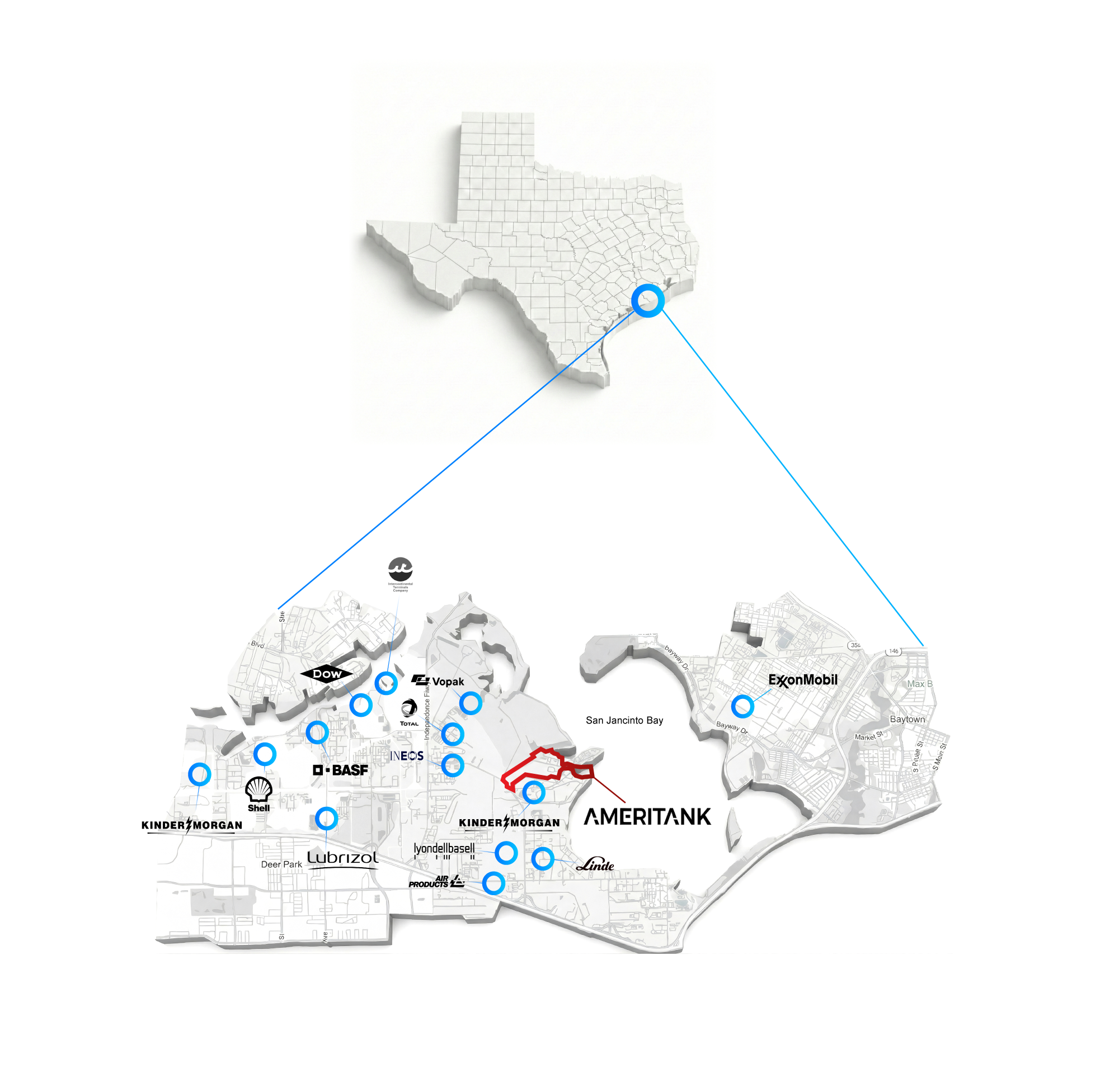 Adjacent to ExxonMobil Baytown, Kinder Morgan, Enterprise Products, and Phillips 66. Our neighbors produce millions of barrels of NGLs annually—we're positioned to store and move it.